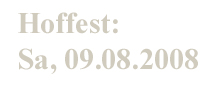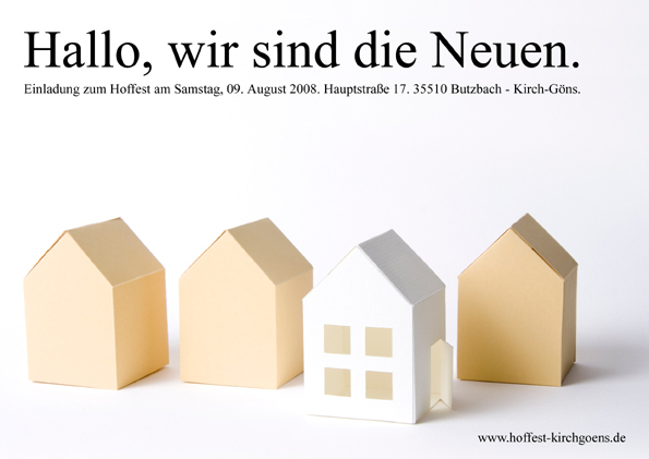 Fragen an dennis@hoffest-kirchgoens.de Hallo Freunde, Nachbarn & Familie!Der Einzug ist geschafft, die Renovierungen sind fertig - jetzt wollen wir gemeinsam mit Euch feiern.Wir laden Euch hiermit auf unser 1. Hoffest am Samstag, 09. August 2008 ab 18.00 Uhr zum Grillen ein. Für ausreichend kühle - später heiße Getränke sowie Beilagen ist gesorgt. Wir bitten Euch darum, Euer Grillgut mitzubringen. Eine Anfahrtsbeschreibung findet Ihr unter dem Menüpunkt Anfahrt. Wer von weiter her kommt, kann gerne hier übernachten. Teilt uns dieses nur kurz mit. Wir freuen uns auf Euch in der Hauptstraße 17. 35510 Butzbach - Kirch-Göns. Solltet Ihr (leider) nicht kommen können, wäre es schön, wenn Ihr uns per Email oder telefonisch unter 06033-9279429 absagen könntet. Dennis & Susi. Ein wichtiger Hinweis für unsere Nachbarn:Wir laden Sie / Euch bereits um 15.00 Uhr zu Kaffee und Kuchen ein. Jeder ist herzlich willkommen, der uns kennenlernen möchte. Gerne können Sie / könnt Ihr weitere Nachbarschaft und Freunde mitbringen. Ab 18.00 Uhr wird im Hof gegrillt. Wer hierzu bleiben mag, ist herzlich eingeladen. Für ausreichend kühle - später heiße Getränke sowie Beilagen ist gesorgt. Wir bitten darum, Grillgut mitzubringen. Dennis Bahl & Susanne Rachel.